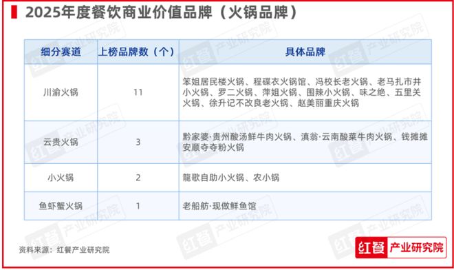 “2025年度餐饮商业价值品牌”上榜的火锅品牌共有17个,从细分品类上看,上榜的火锅品牌主要集中在川渝火锅,占了11席。云贵火锅、小火锅上榜品牌数量均较上年度有所增长,上榜品牌分别有3个、2个。鱼虾蟹火锅品类中的上榜品牌为老船舫·现做鲜鱼馆。