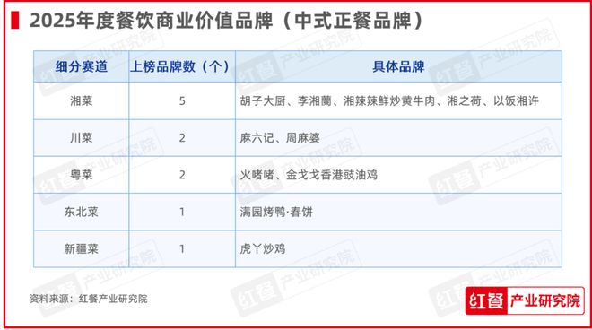 “2025年度餐饮商业价值品牌”中,中式正餐赛道共有 11 个品牌凭借自身实力脱颖而出,荣耀上榜。其中,湘菜上榜品牌共有5个,川菜和粤菜分别有2个,东北菜和豫菜则均有1个上榜品牌。