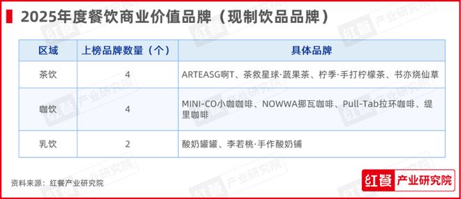 “2025年度餐饮商业价值品牌”共有10个现制饮品品牌上榜。其中,茶饮上榜品牌有4个,咖饮上榜品牌有4个。此外,本年度还新增了乳饮品牌酸奶罐罐和李若桃·手作酸奶铺。