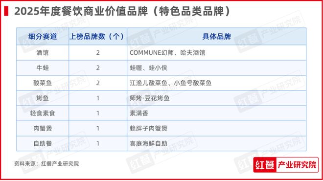 除了烧烤赛道,特色品类品牌在本年度同样成绩斐然,上榜品牌数量达到10 个,较上一年度增加了 4 个。这些上榜品牌广泛覆盖 7 个细分赛道,其中酒馆、牛蛙、酸菜鱼这三个赛道均有 2 个品牌上榜。