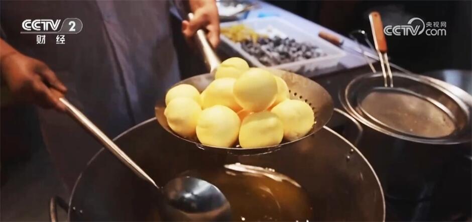 很有游客来到临海都会打卡这里最经典的小吃“蛋清羊尾”,因为长得像羊尾巴,所以被叫作蛋清羊尾。作为国宴甜品,它是最早进入《中国菜谱》的名小吃。将提前准备好的蛋清打成奶油状,夹起一块豆沙或板栗馅料,将蛋清裹在馅料外,就可以放入油锅炸了。出锅后,撒上一层糖霜就做好了。