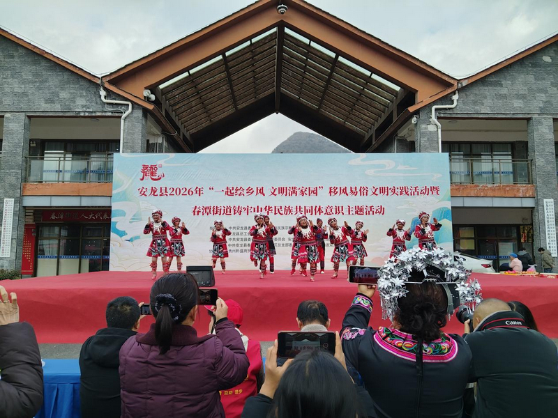 上午9点,随着一阵喧天锣鼓响起,两头活灵活现的狮子在舞台上跃动起来,非遗表演《舞狮》拉开“安龙县2026年‘一起绘乡风,文明满家园’移风易俗文明实践活动暨春潭街道铸牢中华民族共同体意识主题活动”的帷幕。民族舞蹈《中华龙舞起来》《布依族八音坐唱》《苗乡情》、彝族独唱《不要怕》等各族群众自编自演的17个原生态节目轮番上演,期间穿插着移风易俗宣讲、知识抢答和文明家庭颁奖活动。看到精彩处,台下观众掌声雷动,欢呼不断,勾勒出一幅“中华民族一家亲、同心共筑中国梦”的绝美画卷。