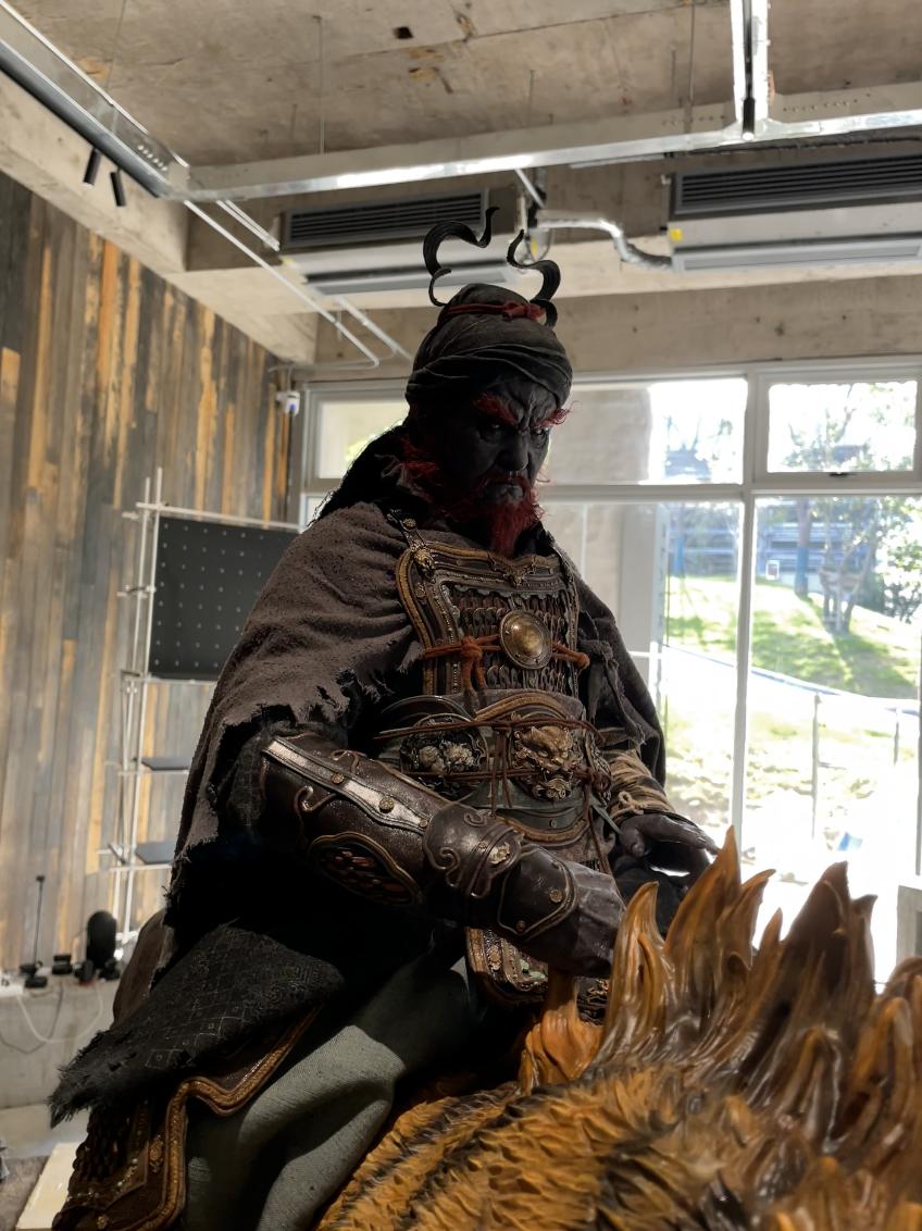 除了钟馗骑虎,店内还有逼真的黄眉与二郎神等雕像,同样质感出色,让人仿佛置身于《黑神话:悟空》的神话世界中。墙壁上,布满了游戏主要角色的海报,展架上则摆放着小西天土地的大型手办及钟馗骑虎主题手办等,全方位展现游戏魅力。